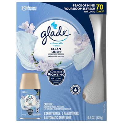 Glade Automatic Spray Refill Clean Linen continuously scents your room. Refillable Clean Linen Automatic Spray Starter Kit Enjoy up to 60 days of continuous watery melon and clean crisp air with sparkling citrus blends freshness with Glade Clean Linen Automatic Spray Starter Kit. Up to 7 cash back Product Title Glade Automatic Spray Refill 2 CT Clean Linen 124 OZ.
