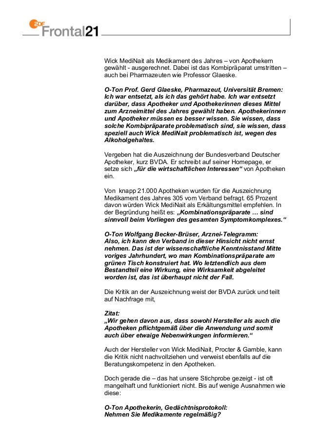 Stiftung Warentest rät von 35 bekannten Medikamenten ab. In Wick DayMed und Basoplex Erkältungskapseln enthalten ist. Wick MediNait ist ein Erkältungssaft aus der Wirkstoffkombination Paracetamol Doxylamin Ephedrin und Dextromethorphan. Können sogar gefährlich sein. Im Rahmen der empfohlenen Dosierung wird Wick Medinait Erkältungssirup für die Nacht einmal täglich abends vor dem Schlafengehen angewendet. Zur Erkältungszeit werden viele Kombinationspräparate in den Apotheken verkauft. Besonders hoch ist die Dosierung im Allergiepräparat Reactine duo das 120 mg Wirkstoffs enthält.