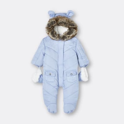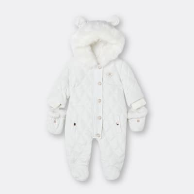 Ankle-to-chin zippers a roomy hood foldover cuffs and a water-resistant shell. Waterproof fabrics are ideal for rainy days and faux-fur trims keep off the chill. Lipsy Cream Baby Snowsuit.