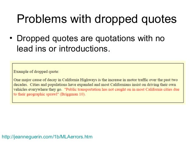If you start your sentence without explaining whos speaking then the effect on the reader can be jarring. C a quote that is not properly cited in MLA format. A dropped quotation or paraphrase sometimes simply called a dropped quote are lines or passages from your researched sources that stand alone as sentences inside your work or are spliced into your ideas in a way that does not indicate to whom they belong. Fernando Mondragón A010222219Using QuotationsUsing quotes is a very important resource that you can use in your writing because it supports the points that you are trying to explain gives your work a factual basis protects yourself against plaigarism and allows the reader to locate the material that you consultedIt is important to blend quotations smoothly with your own. If you start your sentence without explaining whos speaking then the effect on the reader can be jarring. In order to transition into your quotation smoothly avoid dropped quotations in your writing. If a citation ends the sentence the quotation may look like the first example below. Quotations cannot stand alone but must be integrated into your prose. Dropped quotes are a real problem for new writers.
