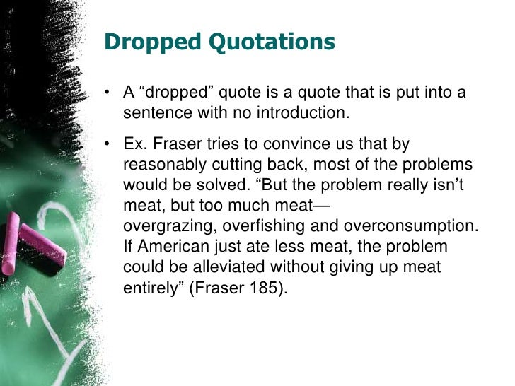 Dropped quotations are those quotations that appear in the middle of. To avoid dropping quotes in use signal phrases. A dropped quote is a quote from someone else that is placed in your writing but it stands alone and is not introduced and not integrated into a sentence of your own.