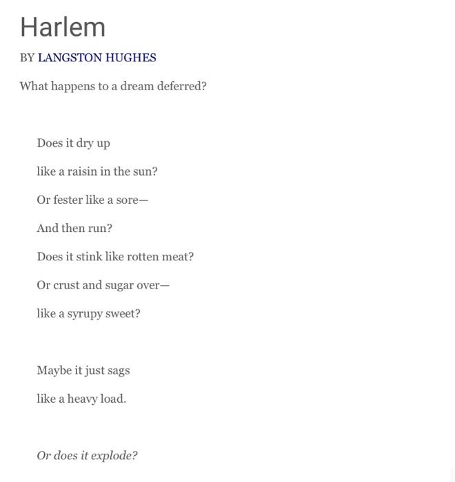What happens to dream deferred. A short but POWERFUL poem by the great Langston Hughes. Or crust and sugar over-- like a syrupy sweet. The pain will be worse because it is untreated fester like a sore.